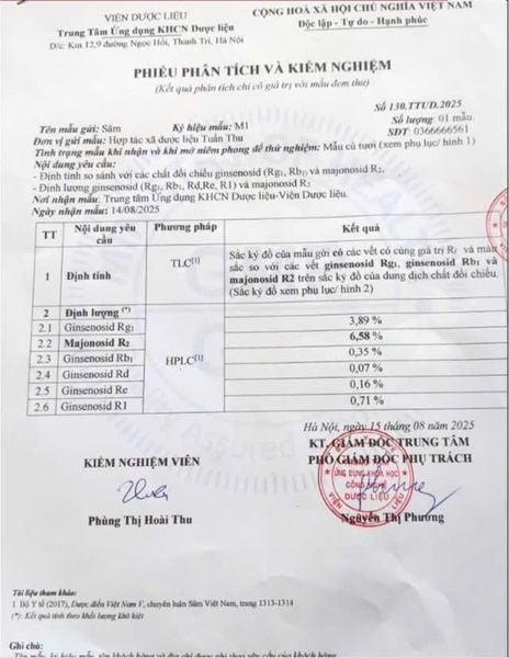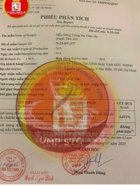 Toàn bộ báo cáo bao gồm bảng hoạt chất, kết quả phân tích, mộc xác nhận và chữ ký chuyên môn, bảo đảm tính chính xác và minh bạch trong từng lô sản phẩm được kiểm tra.