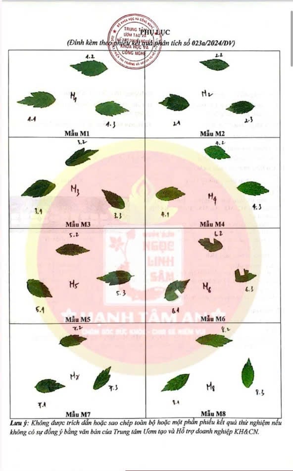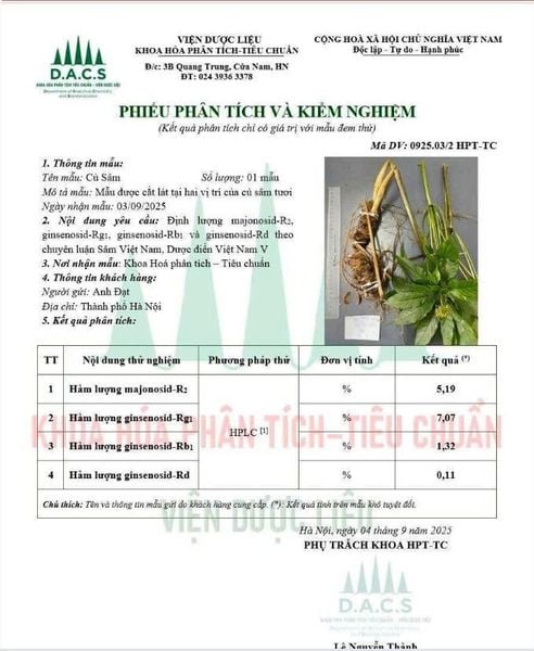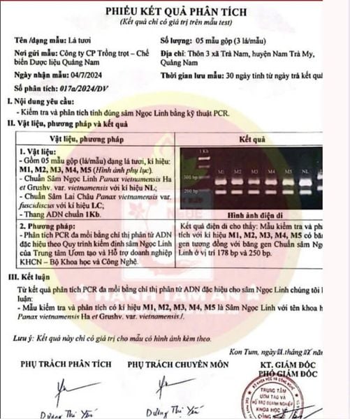 Sản phẩm được xác thực nguồn gốc bằng kỹ thuật PCR tại đơn vị kiểm nghiệm chuyên ngành. Mẫu lá tươi được thu theo lô, niêm phong và đối chiếu trực tiếp với giống chuẩn Panax vietnamensis. Kết quả điện di cho thấy mẫu đạt đặc điểm ADN tương ứng với giống chuẩn, được ghi nhận bằng hình ảnh và biên bản phân tích kèm theo.
